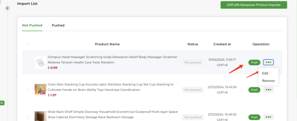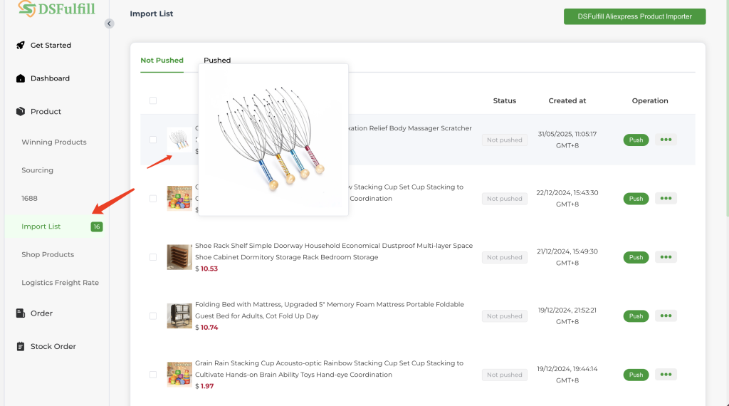 From the Import List, push the collected product to your Shopify store. DSFulfill will sync the product details, ensuring they’re ready for sale on your storefront.