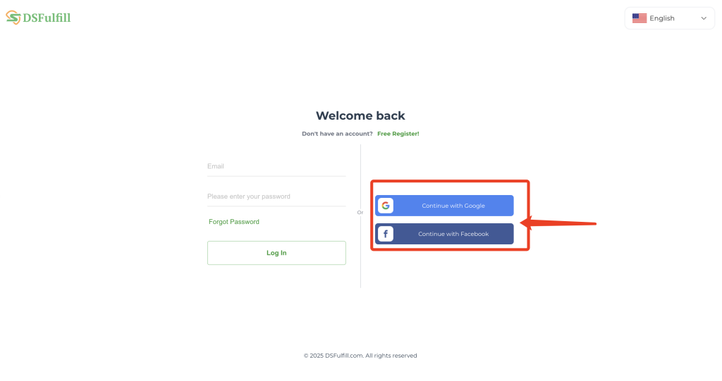 To start, DSFulfill users can access the platform at app.dsfulfill.com. You can log in directly using your Facebook or Google account for quick setup.