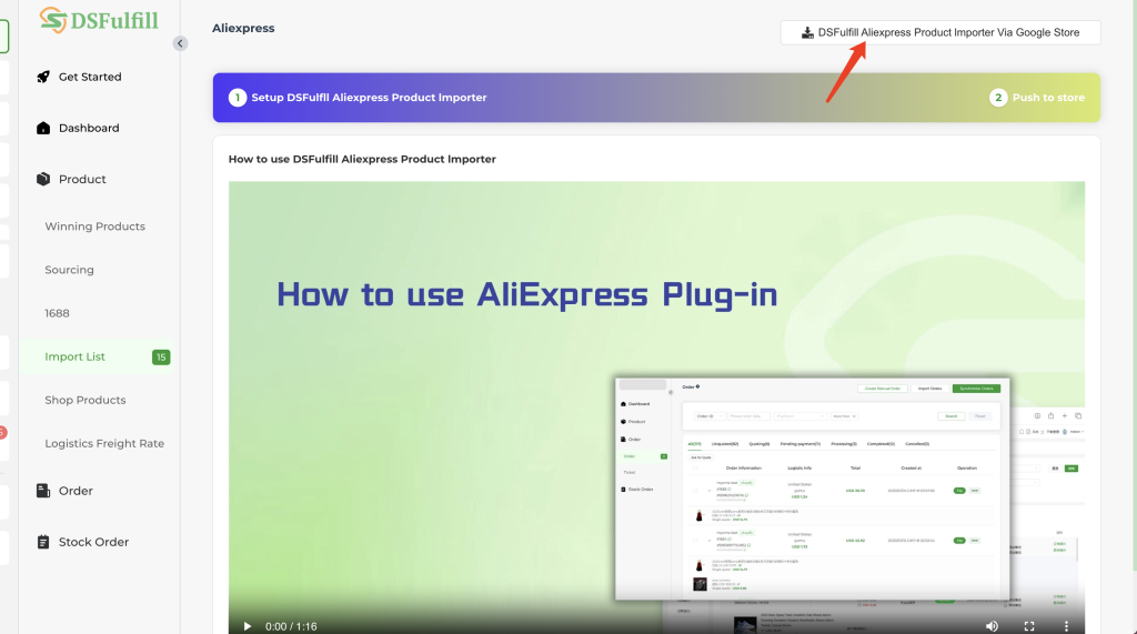 Navigate to the Product menu in DSFulfill and select the Import List section. Click on the DSFulfill AliExpress Product Importer option. A demo video is available on this interface, and we recommend using the Chrome browser for optimal performance. Click the “DSFulfill AliExpress Product Importer Via Google Store” button to proceed.